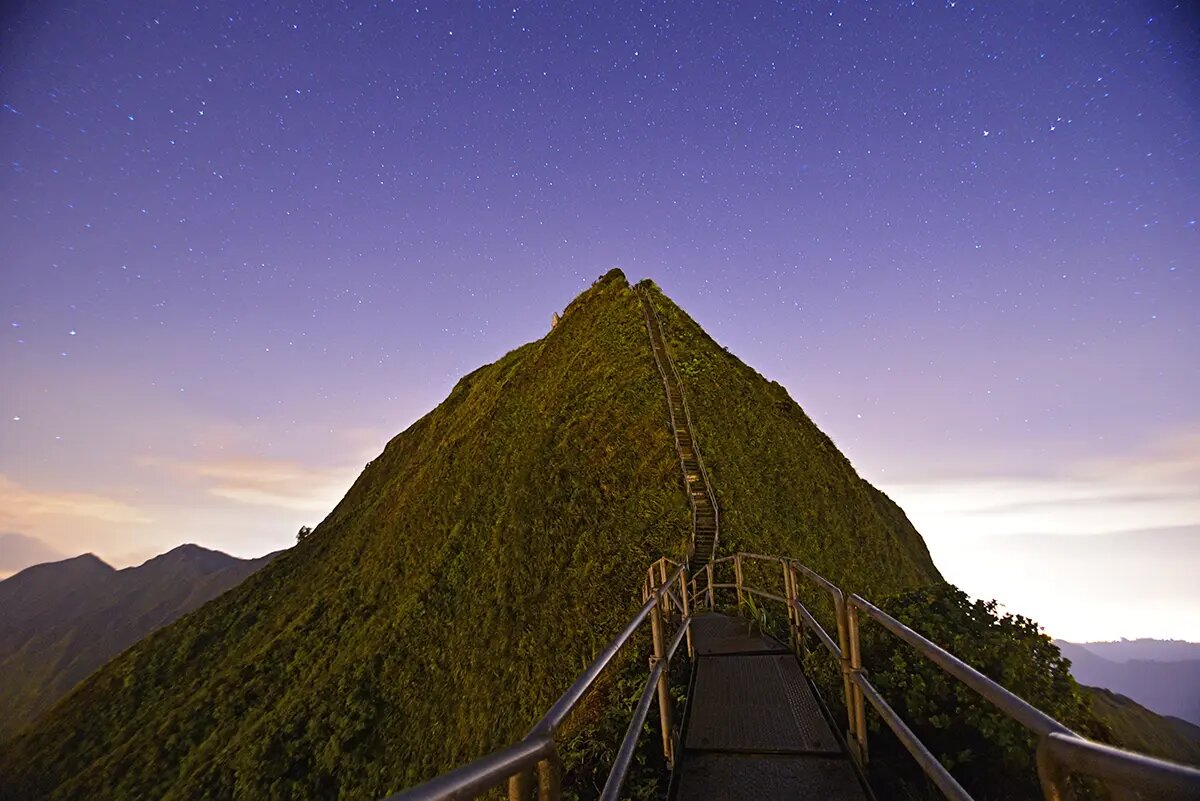 Die Haiku Stairs sind eine steile, schmale Treppe mit 3.922 Stufen, die sich über einen Bergrücken auf Oʻahu erstreckt. Ursprünglich in den 1940er-Jahren für militärische Zwecke gebaut, ist der Zugang heute verboten, doch die Treppe bleibt ein faszinierendes Fotomotiv.