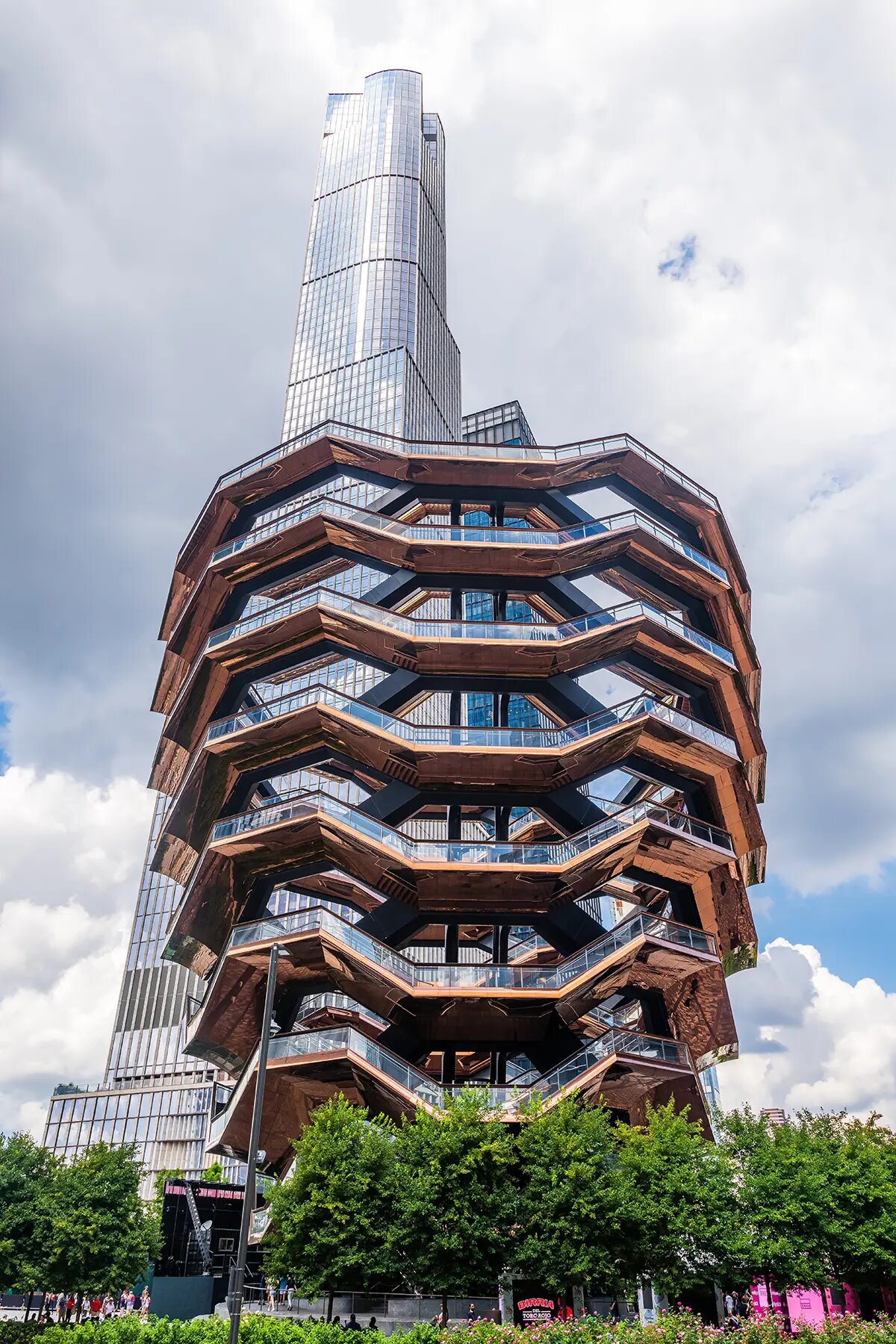 The Vessel ist eine 16-stöckige, wabenförmige Struktur im Hudson Yards-Viertel von Manhattan, entworfen von Thomas Heatherwick. Das Treppenobjekt ist sowohl Aussichtsplattform, Kunstinstallation und Erkundungsfläche in einem. Mit über 2.500 Stufen und 154 miteinander verbundenen Treppenläufen bietet sie Besuchern verschiedene Aussichtspunkte über die Stadt.